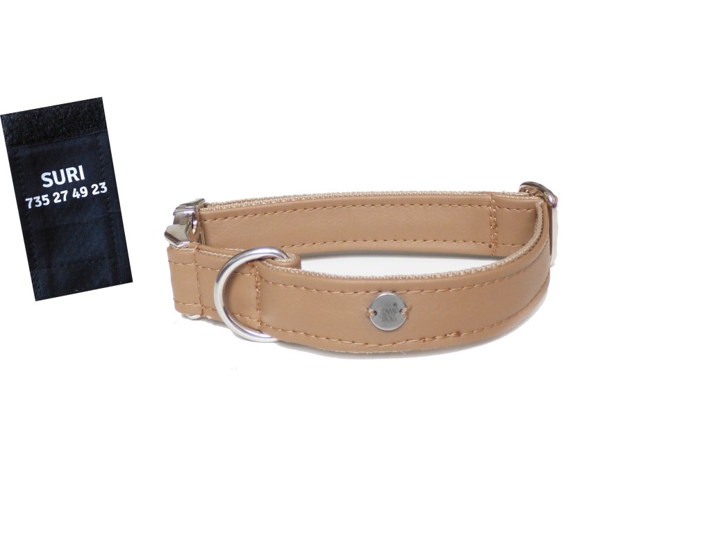 Hnědý obojek pro psa z koženky se jménem a číslem