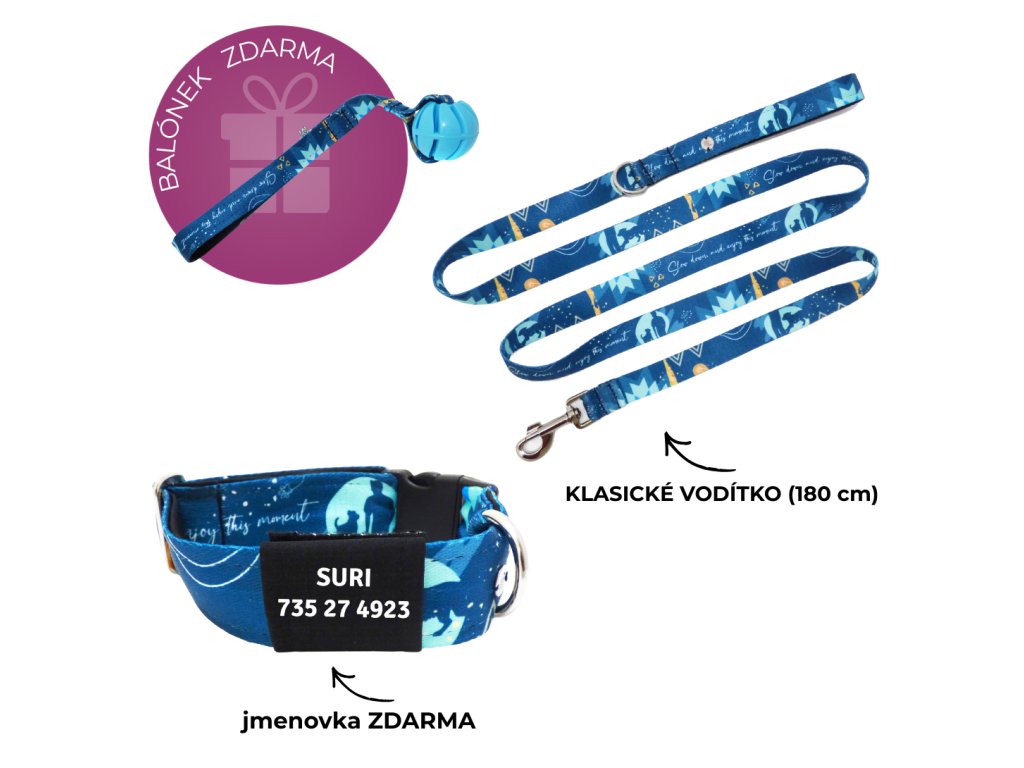 Ručně šitý set obojku a vodítka pro psa + jmenovka zdarma
