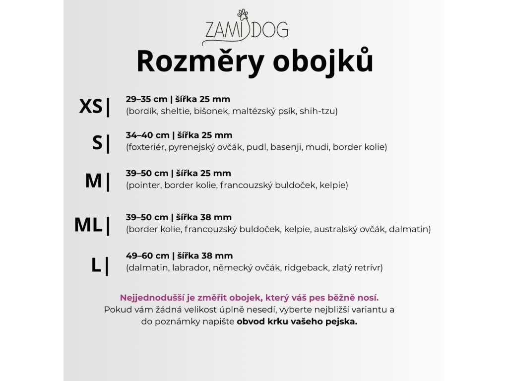 Pokud vám žádná velikost úplně nesedí, vyberte nejbližší variantu a do poznámky napište obvod krku vašeho pejska.