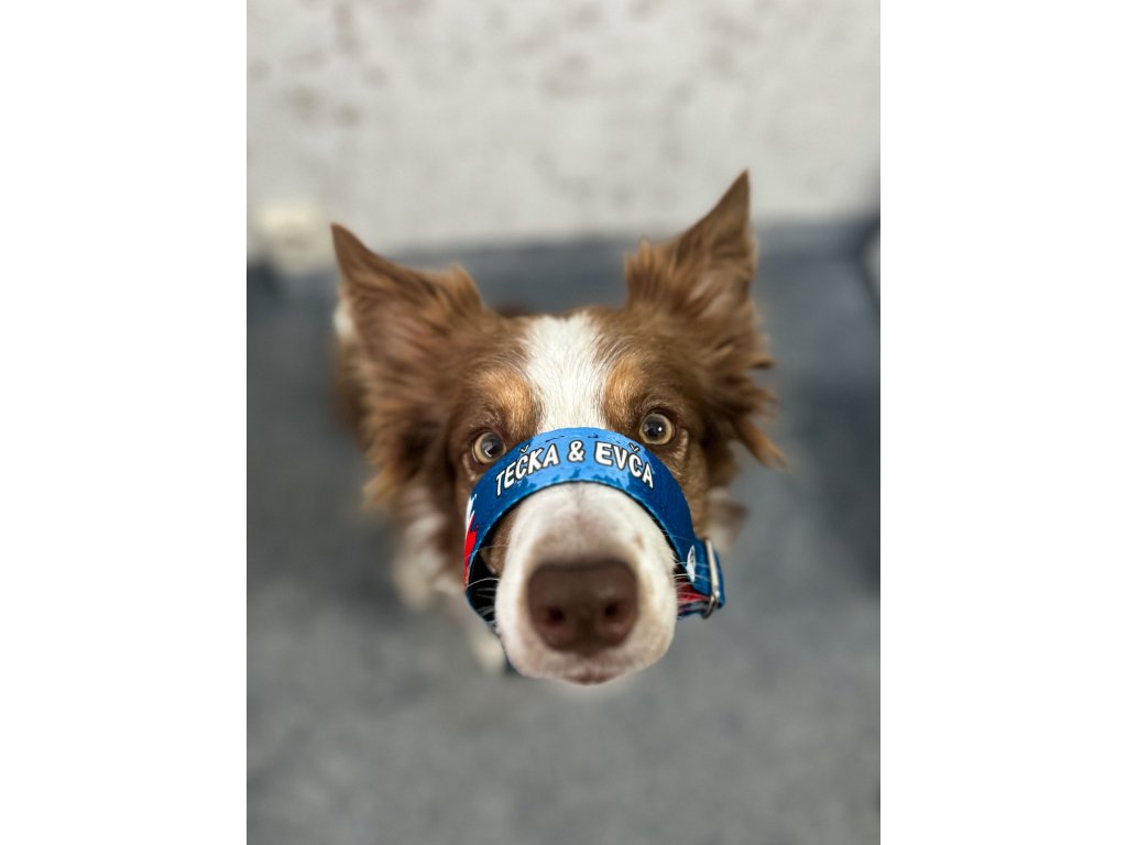 ✔️ pes má potisk telefonu přímo na obojku - bezpečnost na každém kroku