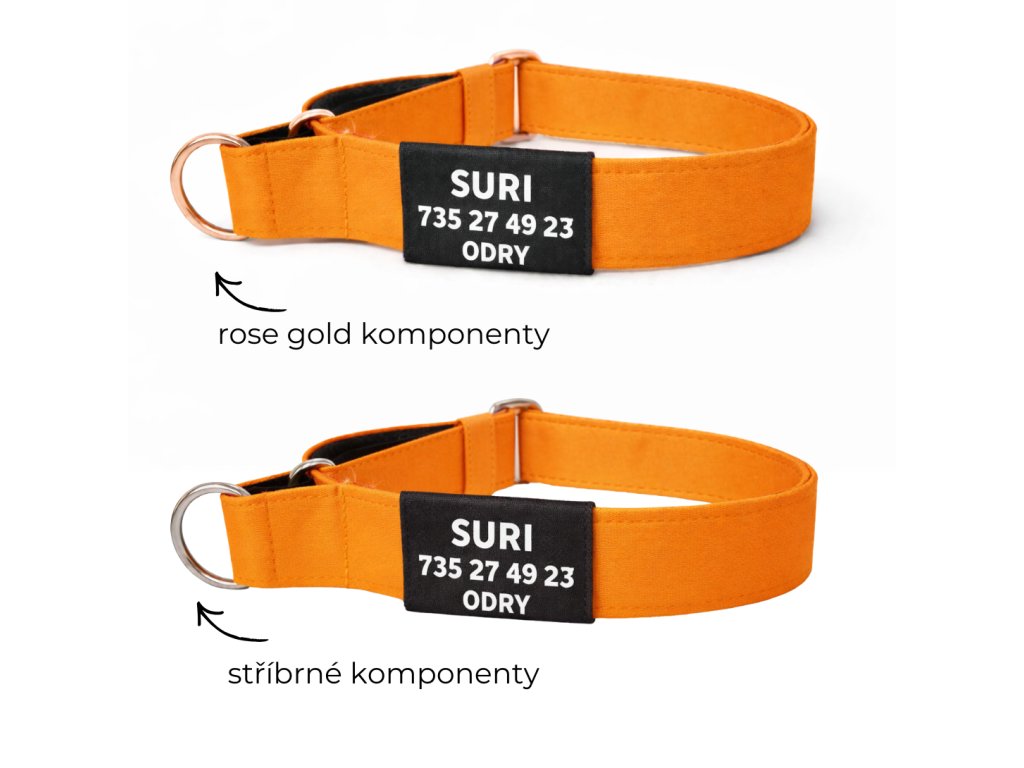 Polostahovací obojek pro psa se jménem oranžové barvy